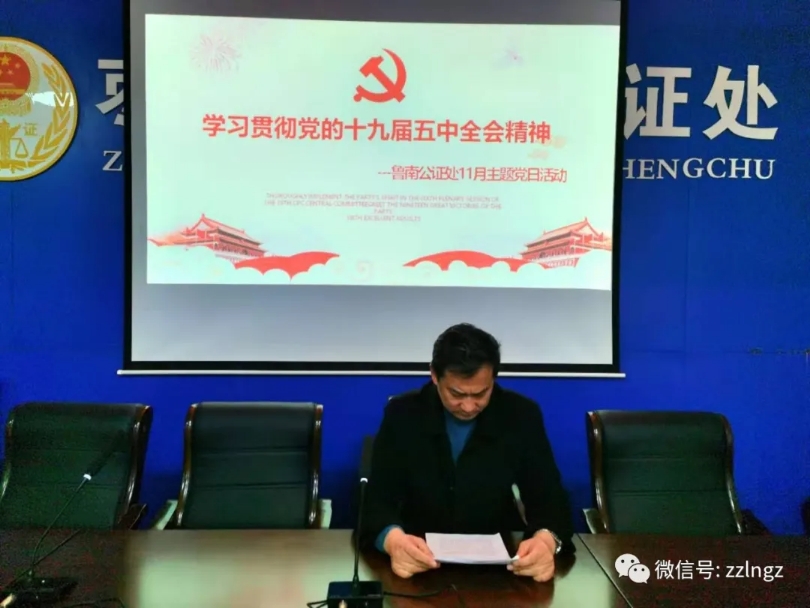 11月27日,枣庄市鲁南公证处党支部在家事服务中心组织党员及青年团员学习贯彻十九届五中全会精神。支部副书记刘卫东同志带领大家共同学习《中国共产党第十九届中央委员会第五次全体会议公报》。